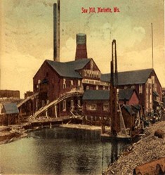 The first sawmill on the Menominee River was built in 1831 by William Farnsworth and Charles Brush. Farnsworth and Brush were granted permission to build a Mill and Dam by the Menominee Indians and also the War Department on un-surveyed Indian lands. Intern they were required to saw lumber and grind grain for the Menominee Tribe and the U.S. Government at a reasonable price. The location of the Mill was on the corner N. Raymond and Riverside Av. approximately 1/8 mile upriver of the Hattie Bridge.