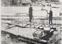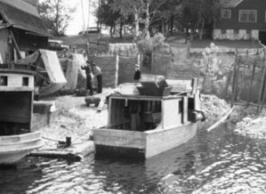 The three photos pictured above (Right to Left) are: Fishing tugs lay anchor on northside of river, the drying of fish nets on stretchers and Seidl’s Wholesale and Retail Fish House on South side of river.