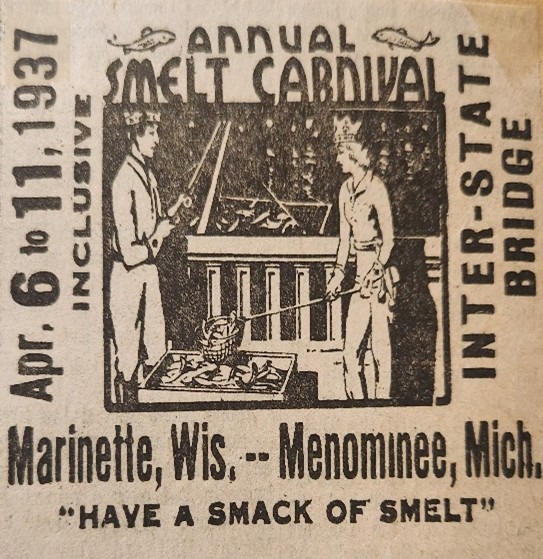 During the early part of the 1900’s through the 1950’s every year in the spring, usually April, a smelt run would occur on the Menominee River. At the height of the run, a Smelt carnival was held, special trains would run up here from cities throughout state bringing fisherman and their families up to enjoy not only the fishing but the many festivities including parades, selection of a Smelt Queen, smelt wrestling and many a good smelt fry.