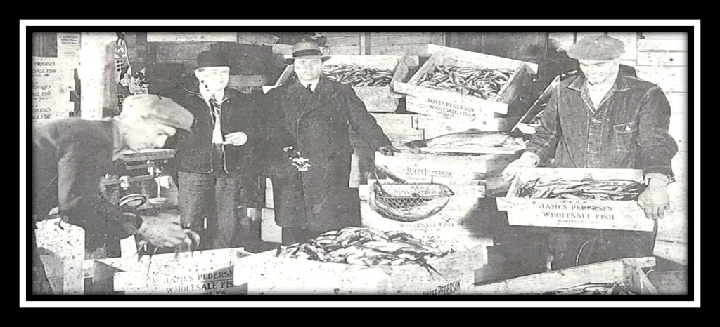 Photo taken probably taken in late 1930’s. From left Carl “Cully” Smith, “Grampa” Jim Pedersen, Salesman, and Charlie Pedersen survey crates of Smelt to be sent to Pres. Franklin D. Roosevelt. Pedersen’s Fisheries on Leonard St. in Menekaunee, processed 24,300 lbs. of fish a week during the peak of the run. Lucille, widow of Grampa’s son Jim worked as part of the crew after her husband’s stroke. She often talked about the union of trust, admiration and affection that existed between the fisherman and the Pedersen crew, she said. “First, you pay the fisherman, then the bills and if there is anything left, ourselves.” Picture taken from Marinette County Historian April 1993 issue.