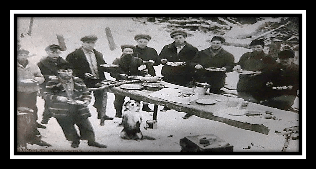 A hot lunch went a long way in keeping the loggers going on cold winter days. Note – camp dog on up on hind paws waiting for a scrap.