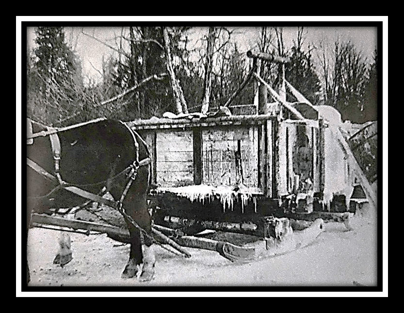 Once chained in place, horses pulled the sleigh on an ice road to the riverbank. The ice roads were maintained by use of a horse drawn water sled which sprinkled water along the path to allow for faster and easier hauling.