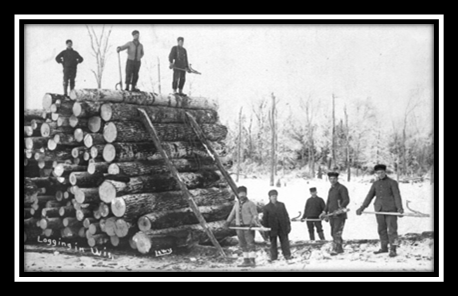 Logs were stacked on the riverbank until the spring thaw. When river levels were high the logs were pushed into the river to float down to the sawmills. This was called “the log drive”.