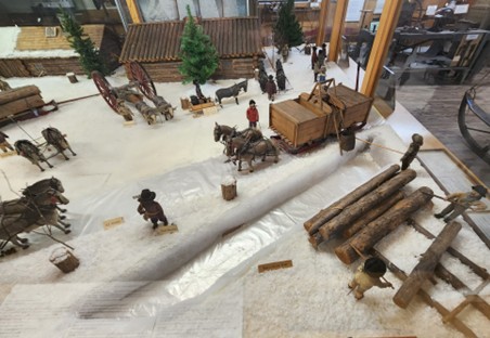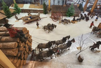 Pictures below are a small representation of the glass enclosed 8′ X 16′ beautiful Diorama hand carved by John Mayer, a former lumberjack, which shows how the process worked.